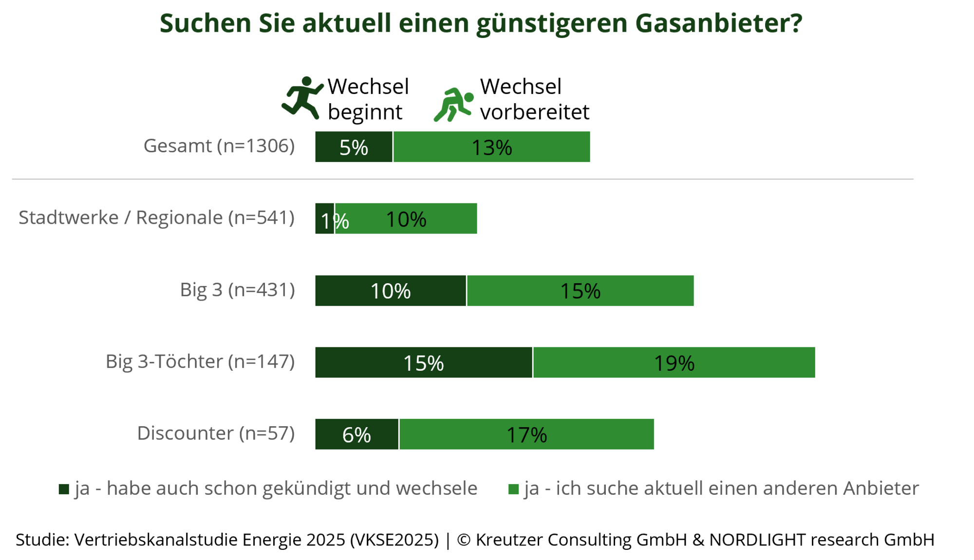 Die Zahl der Preisanpassungen ist im Jahr 2025 leicht gestiegen – vor allem Discounter und sonstige neue Anbieter haben häufiger Preise nach oben angepasst. Viele Haushalte prüfen daher wieder aktiv Alternativen: 5 % der Gaskunden wechseln aktuell, weitere 13 % suchen aktiv. Besonders dynamisch zeigt sich die die Wechselmotivation bei den Töchtern der Big 3: 34 % der Kunden befinden sich im beginnenden Wechsel oder in der aktiven Suche – im Vorjahr waren es nur 19 %.